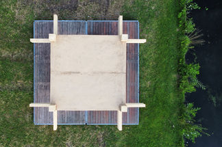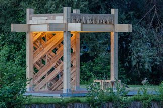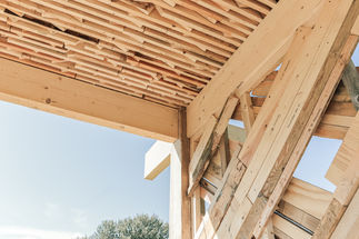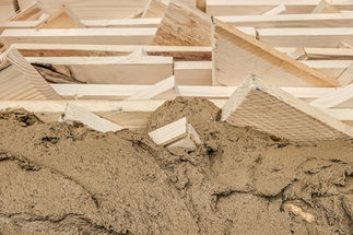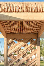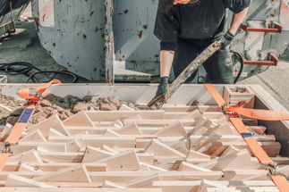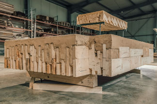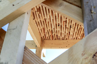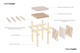 The core of the demonstrator is a floor slab system made from a wood-earth hybrid. This concept utilizes the unique arrangement of irregular leftover wood pieces to create a rough surface that, when filled with earth, forms a metal-free structural shear interface between the two materials. Earth can be seen as an ecological and recyclable concrete substitute that increases the load-bearing capacity of the hybrid building material, but also brings thermal mass into the component and ensures good sound and fire protection.
