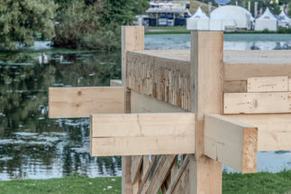 The overall structure exemplifies a fragment of a multi-story building designed with Design for Disassembly principles, employing an interlocking, metal-free joinery system for the primary post-and-beam framework.